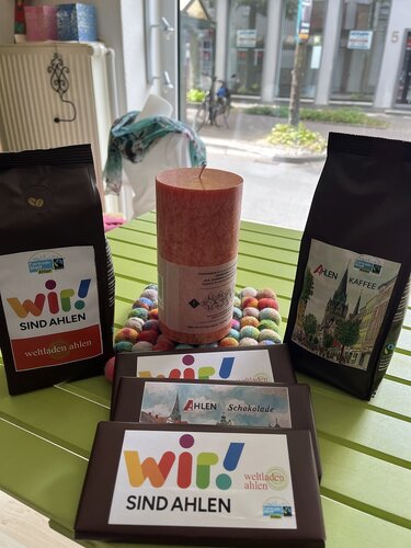 Im Weltladen Ahlen können fairer Kaffee und faire Schokolade mit dem Ahlener Stadtlogo erworben werden. Ein gutes Signal für die Kooperation zwischen dem Weltladen Ahlen und der Stadt Ahlen.