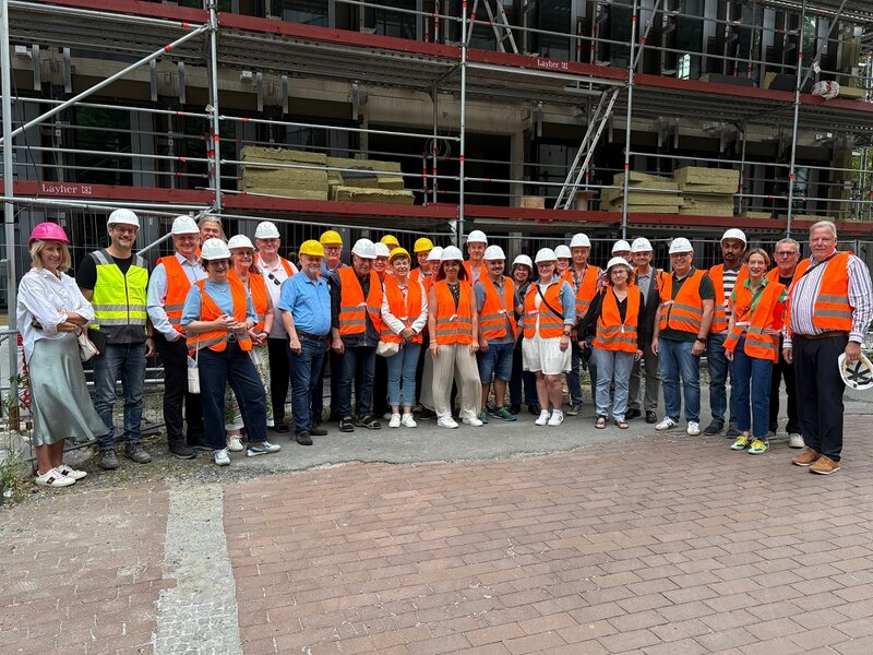 Stadtbaurat Thomas Köpp und der städtische Projektleiter Jan Hintemann haben die Besucherinnen und Besucher durch die Baustelle geführt. Nach der Baustellenbesichtigung ging es mit dem Bus zur Vorhelmer Mühle, wo sich die Delegation die Mühle mit dem darin befindlichen Archiv und dem Trauzimmer anschauen konnte.