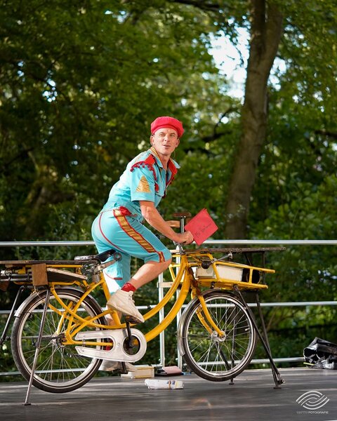 Der zweite Abend des diesjährigen Kultursommers widmet sich ganz der Kunst des Straßentheaters. Um 21 Uhr präsentiert der Künstler Felix Ahlert sein charmantes Stück „Mr. Postman“. Mit schräger Akrobatik und Artistik auf einem Postfahrrad verzaubert er das Publikum und erzählt die liebevolle Geschichte eines Postboten, der gegen Zeit und Schwerkraft ankämpft.
