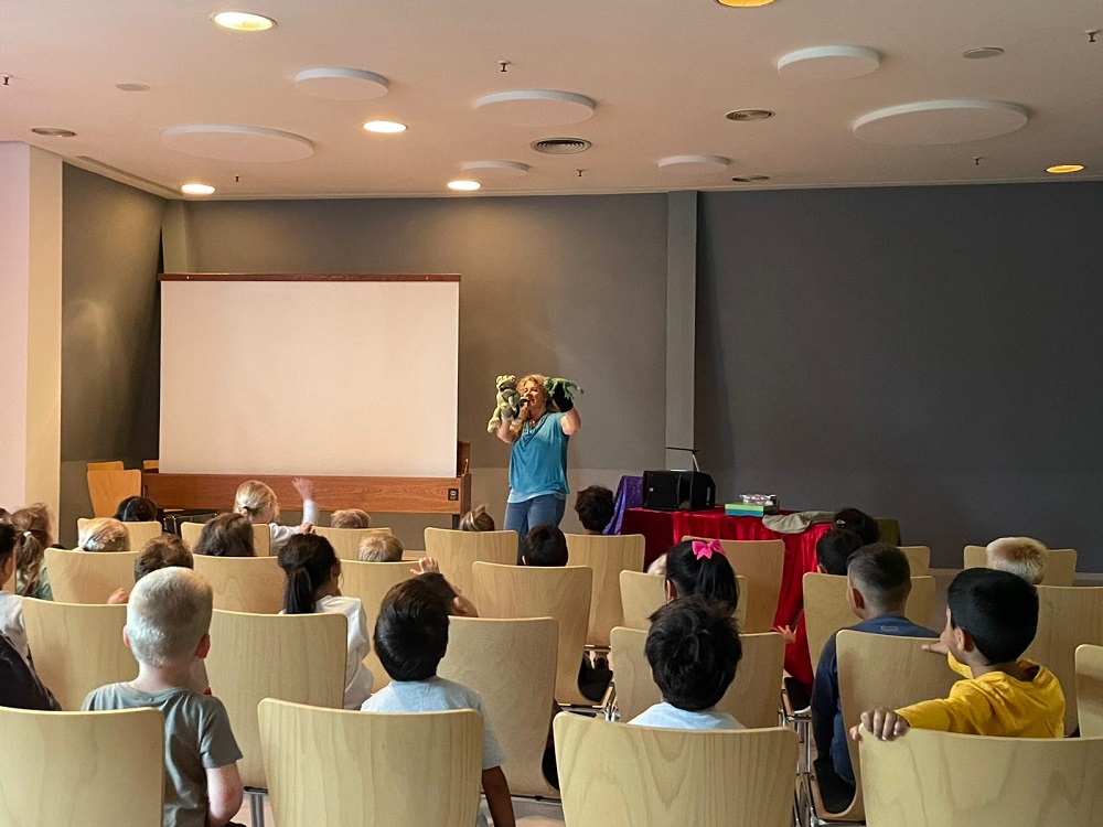 Doch bevor Balduin seine Geschichte preisgab, mussten die „Kulturknirpse“ ihn erst mithilfe eines Liedes aus seinem Versteck locken. Auch danach war aktives Mitmachen gefragt: Gemeinsam überlegten die Kinder, wovon sich Chamäleons ernähren, und suchten Balduin und seine Freunde auf den Bildern der Lese-Show, die mit einem Diaprojektor an die Wand geworfen wurden. Eine knappe Stunde lang waren Konzentration, Fantasie und Freude gleichermaßen im Einsatz.