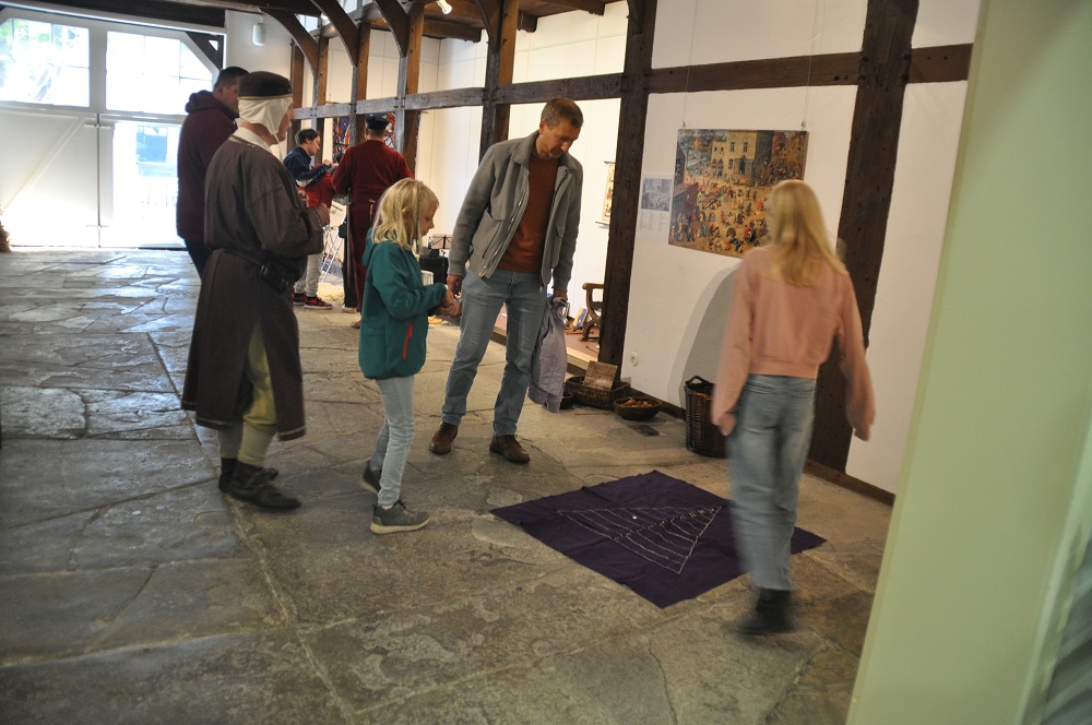 Speziell für Familien mit Kindern aber auch für Einzelbesucher gibt es noch Einiges zum Ausprobieren: mittelalterliche Spiele, ein Scriptorium, in dem Lesezeichen gestaltet werden können, das Mahlen von Mehl mit einer Handmühle, das Spinnen von Wollfäden mit einer Handspindel und ein Basteltisch für Ritterhelme und Kronen aus Pappe.