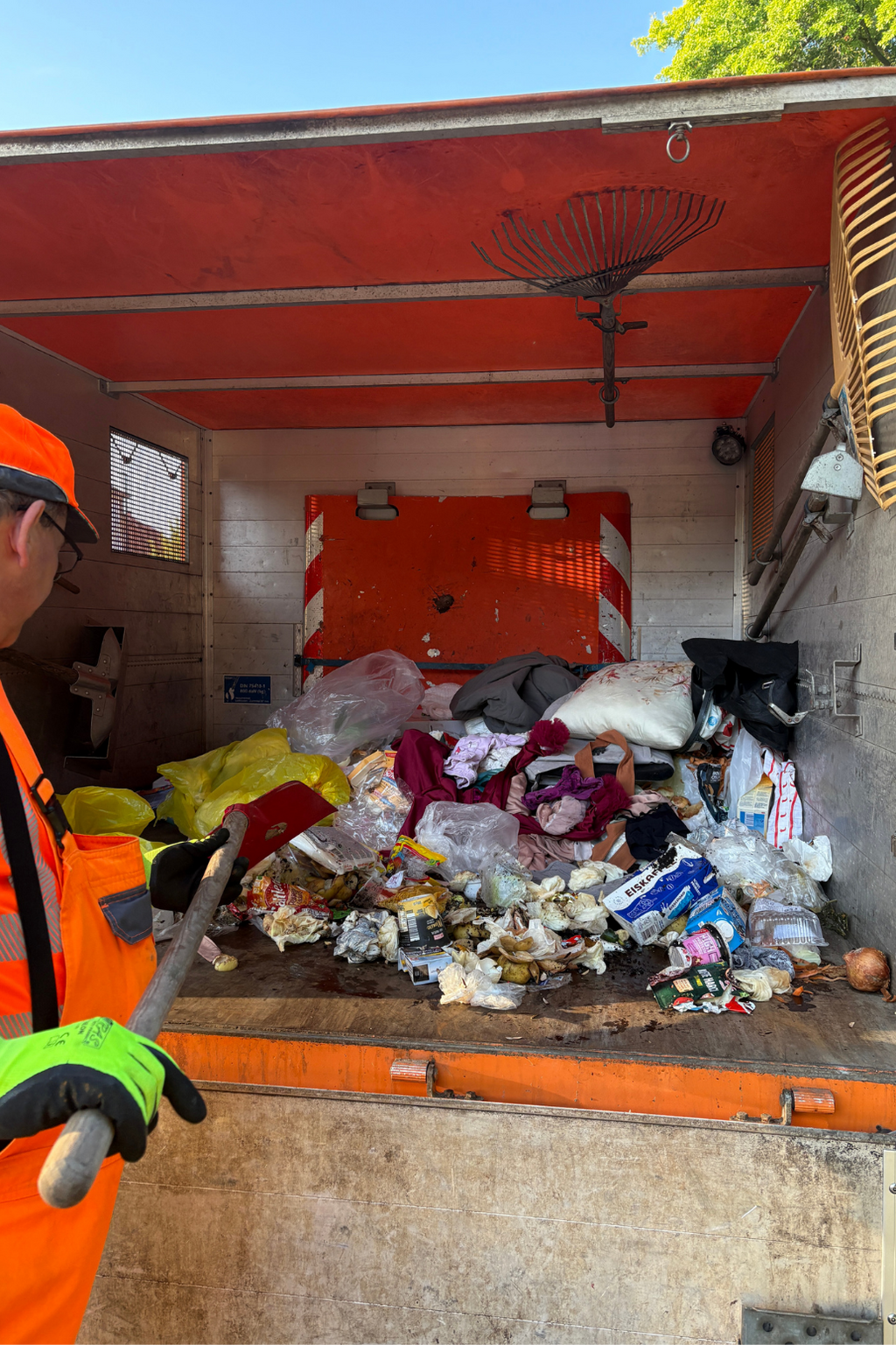 Am nächsten Stopp wird klar: Hier geht es um mehr als überfüllte Mülleimer. Hinter den Containern türmen sich Säcke, dazwischen liegen Kinderspielzeug, Sperrholzplatten – und ein Haufen Maisreste. „Hier brauchen wir Verstärkung“, sagt Gries ins Telefon. Wenig später fährt ein Pritschenwagen vor. Handschuhe an, Müllsäcke auf – und wieder dieser unverkennbare Geruch. Fliegen schwirren auf, während die Mitarbeiter den Inhalt durchsuchen. Neben verdorbenem Essen finden sie Akkus, Farbdosen und Elektroschrott – Dinge, die nicht nur illegal, sondern auch gefährlich sind. „Genau das ist der Grund, warum manchmal unsere Müllfahrzeuge brennen“, erklärt Gries.