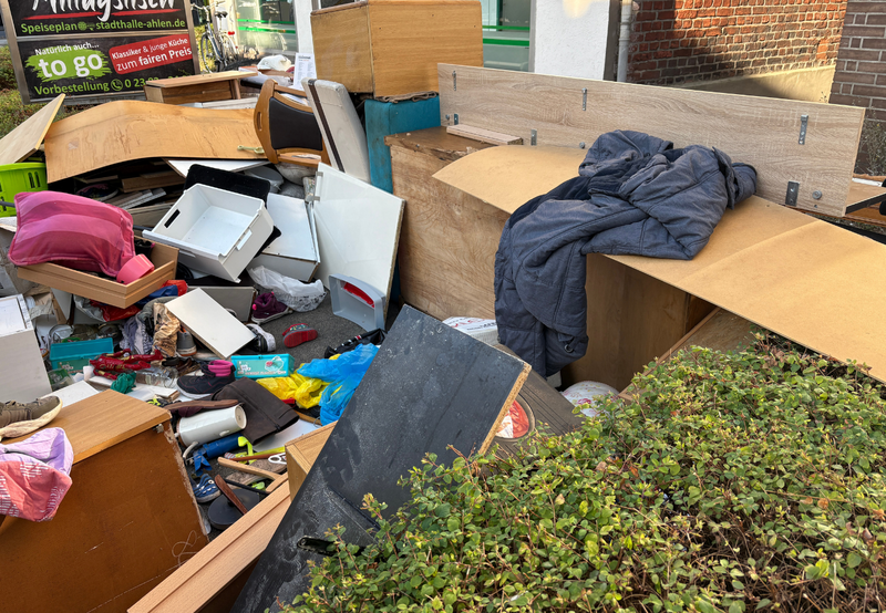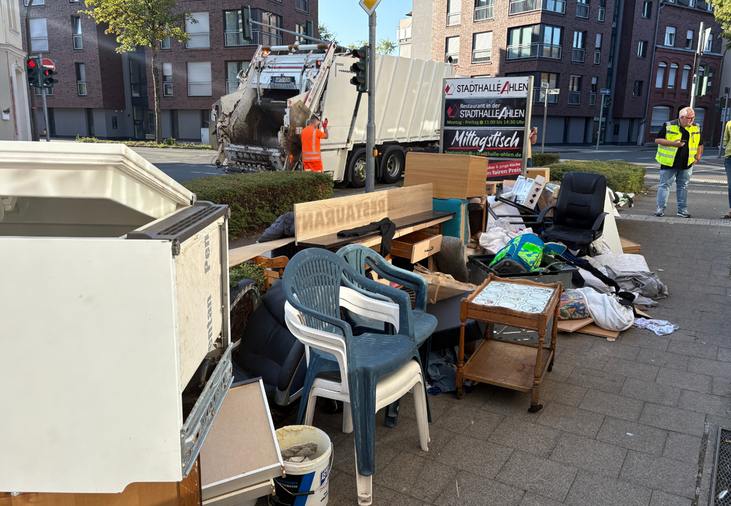 Zum Ende der Tour geht es in die Nähe der Innenstadt. Hier ist Sperrmüll angemeldet – vier Kubikmeter. Vor Ort sind es acht, darunter Hausmüll und Elektroschrott. „Das ist ein Paradebeispiel für die wundersame Vermehrung von Müll“, sagt Gries trocken. „Bis zur Abholung haftet derjenige, der den Sperrmüll angemeldet hat.“