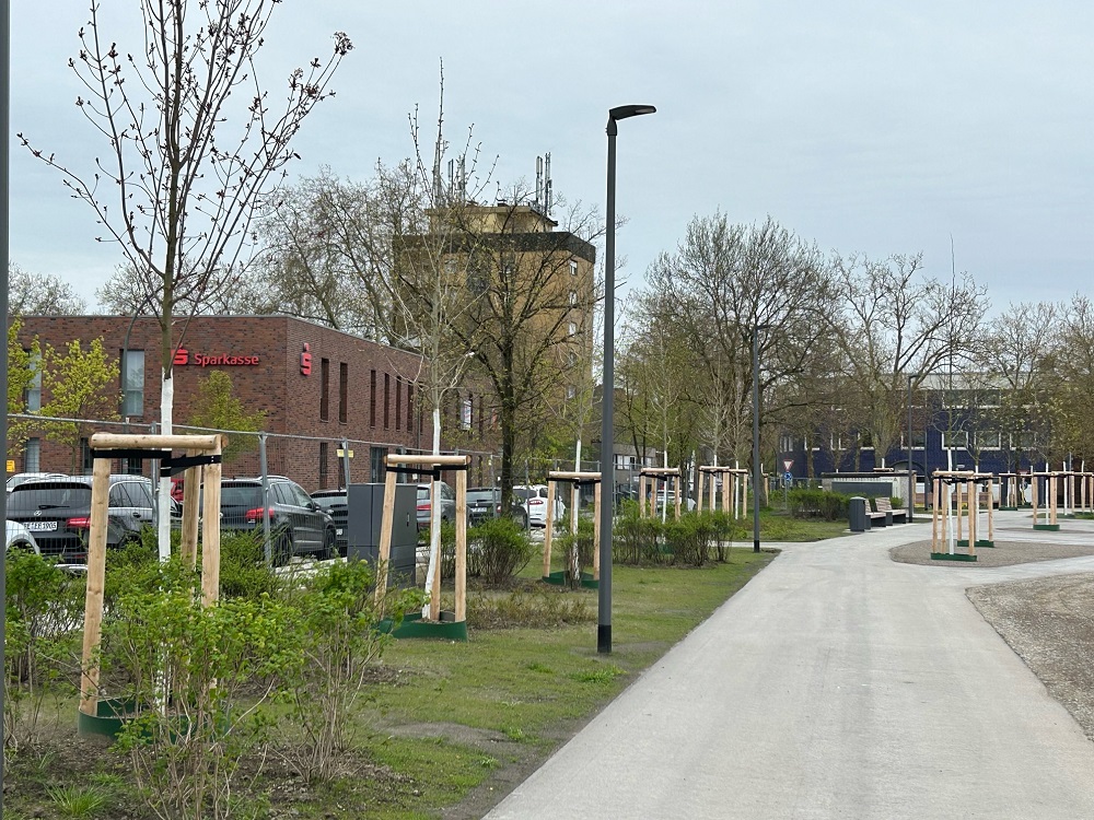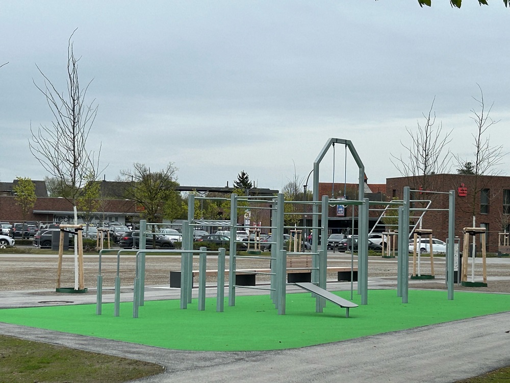 Im Mittelpunkt des Konzepts steht eine klare Neuordnung der Flächen: Die Parkplätze wurden an den nördlichen Rand verlegt, während großzügige Aufenthalts- und Aktionsbereiche nun das Zentrum bilden. Zusätzliche Grünflächen, schattenspendende Bepflanzung sowie Maßnahmen zur Klimaanpassung – etwa zur Versickerung von Regenwasser – tragen zu einer spürbar höheren Aufenthaltsqualität bei. Auch zahlreiche Ideen aus der Bürgerschaft sind in die Planung eingeflossen und prägen das neue Erscheinungsbild des Platzes maßgeblich.