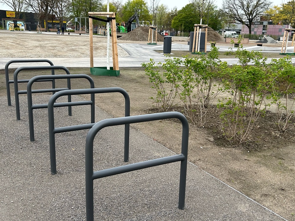 Aus einer zuvor wenig einladenden Schotterfläche mit Parkplatz ist ein lebendiger, parkähnlicher Raum entstanden, der künftig als zentraler Treffpunkt im Quartier dienen soll. Die Planung für die Neugestaltung entwickelte das Berliner Büro „Franz Reschke Landschaftsarchitektur“, das sich in einem Wettbewerb gegen sieben weitere Entwürfe durchsetzen konnte. Ziel war es, die in die Jahre gekommene Fläche grundlegend aufzuwerten und einen attraktiven Aufenthaltsort mit ganzjährig vielfältigen Nutzungsmöglichkeiten zu schaffen.