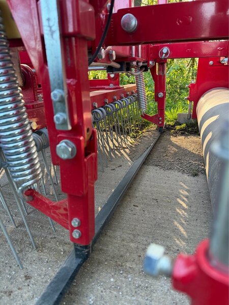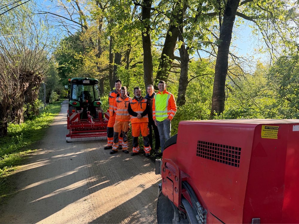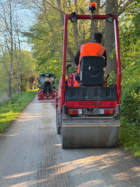Mehrere Tage war das Team entlang der Strecke im Einsatz. Vom Übergang zur Nachbarstadt Beckum bis zur Kläranlage wurde die Fahrbahn umfassend instandgesetzt. Besonderes Augenmerk lag auf den wassergebundenen Abschnitten: Sie wurden mit Dolomitsand aufbereitet, um wieder eine gleichmäßige und gut befahrbare Oberfläche zu gewährleisten. Zum Einsatz kam dabei ein sogenannter Federzinkenegalisierer, der den Belag auflockert, durchmischt und anschließend mit einer schweren Walze glättet.