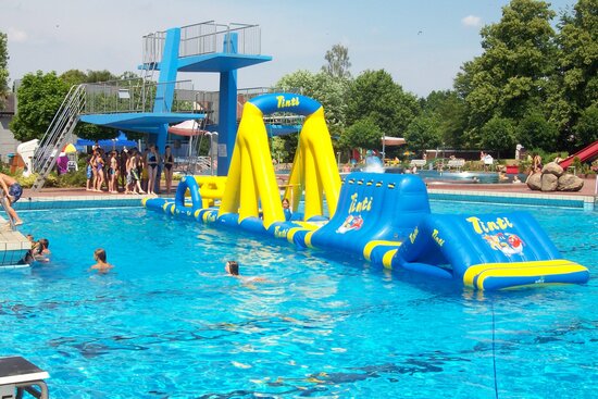 Dann aber geht’s erst richtig los. Im Wasser laden aufblasbare Großspielgeräte in vielen bunten Farben und Formen zum Spielen und Toben ein, da schwimmen krasse Seeungeheuer, Wasserschildkröten, Riesenkraken und sogar ein Disco-Hase. Auf den coolen Twister-Inseln lässt sich prima chillen, die lila Laufmatte schafft man nur mit viel Anlauf und Full-Speed, und in den kunterbunten Water-Globes kann man sich prima übers Wasser kugeln.