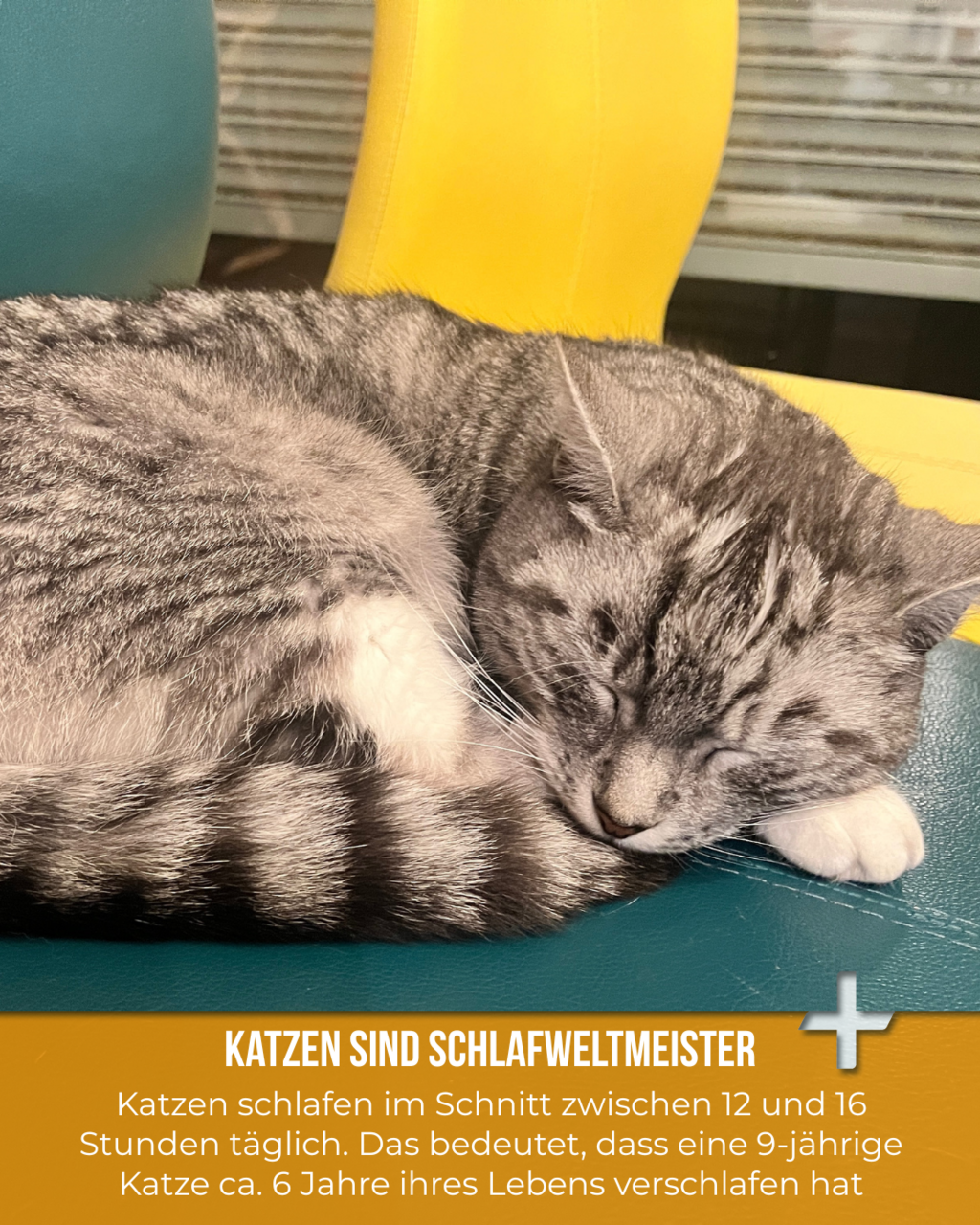 Wusstest du, dass Katzen bis zu 16 Stunden am Tag schlafen? Im Laufe ihres Lebens verschlafen sie rund zwei Drittel ihrer Zeit – eine neun Jahre alte Katze hat also bereits etwa sechs Jahre geschnarcht! Der Grund: Katzen sind von Natur aus Raubtiere. In freier Wildbahn brauchen sie viel Energie für die Jagd – auch wenn die meisten Hauskatzen ihre "Jagd" heute auf dem Sofa oder beim Spielzeugmäuschen erledigen.