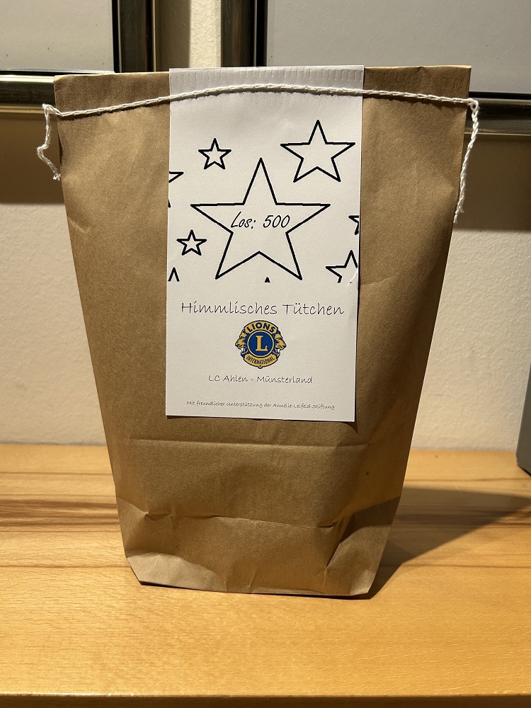 Ein „Himmlisches Tütchen“ kostet wie im Vorjahr 15 €. Durch den Verkauf der Tüten wird die Arbeit des Lionsclubs Ahlen Münsterland unterstützt, denn die Einnahmen kommen den Lionsprojekten für die Jugendlichen und Kinder vor Ort zugute. Hierzu zählen beispielsweise das Engagement der Ahlener Lions für Schwimmkurse für Kindergarten- und Grundschulkinder, für das Projekt „Klasse 2000“ oder für den Lunchclub.
