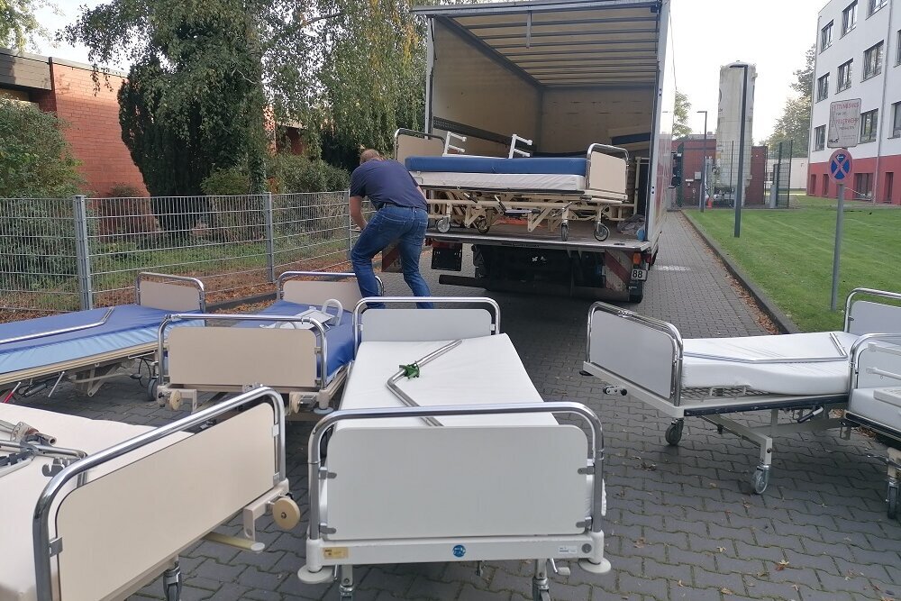 Die Ukraine Hilfe Ahlen e.V. freute sich u.a. über die Unterstützung des St. Franziskus Hospitals. Das Ahlener Krankenhaus stellte 13 Krankenbetten und einige Spritzenpumpen zur Verfügung. Aus einer Praxisauflösung erhielt der Verein zudem von Dr. Maria Voß ein Ultraschallgerät, einen Defilibrator und sechs Behandlungsliegen.