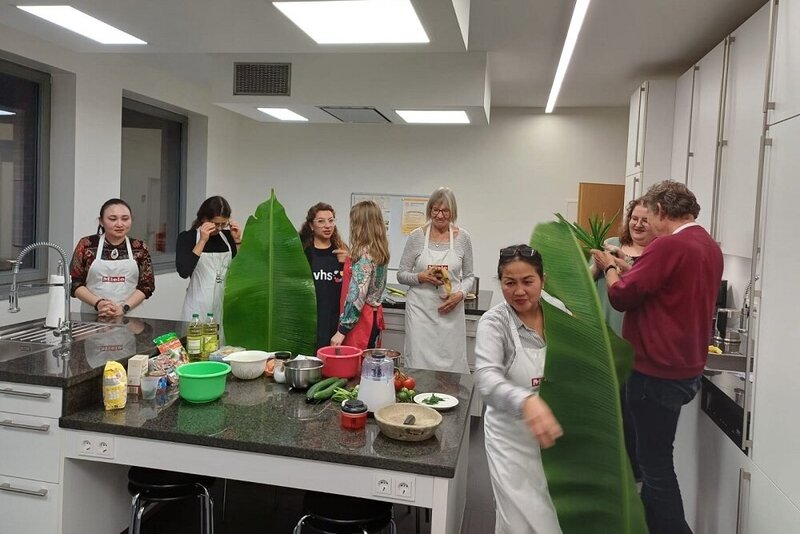 Nach einem ausführlichen Einblick in Land und Kultur leiteten zwei Frauen des IFF die Kochgruppe an, ein mehrgängiges traditionelles Menü zuzubereiten. Deutlich wurde, dass die indonesische Küche gesund und ausgewogen ist und das Potential hat, den weltweiten Hunger zu bekämpfen, denn in Indonesien wird mit wenig Fleisch, viel Gemüse und in den Küstenregionen mit Meeresfrüchten gekocht.