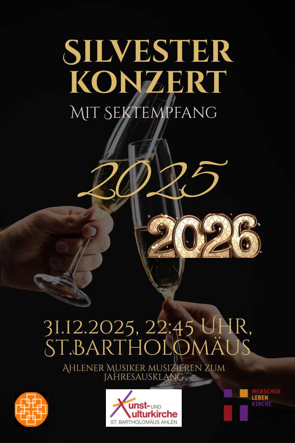 Einen Jahreswechsel mit Schwung - Swing und Klassik, dazu weihnachtliche Ensemble Musik erleben Sie am 31. Dezember um 22:45 Uhr in der Kunst-und Kulturkirche St. Bartholomäus, Ahlen. Im Anschluss um 24 Uhr laden wir zum gemeinsamen Anstoßen auf dem Kirchplatz an der St. Bartholomäuskirche ein. Mit dabei sind Hubertus Rustige (Trompete), Ann Katrin Hoffmann (Gesang) und Eduard Oldenburger (Gitarre), Susanne Mandelkow (Querflöte), Larissa Neufeld, Klavier u.a. Vor Beginn des Konzertes werden die Besucher mit Orgelmusik 4-Händig zum Jahresausklang begrüßt.