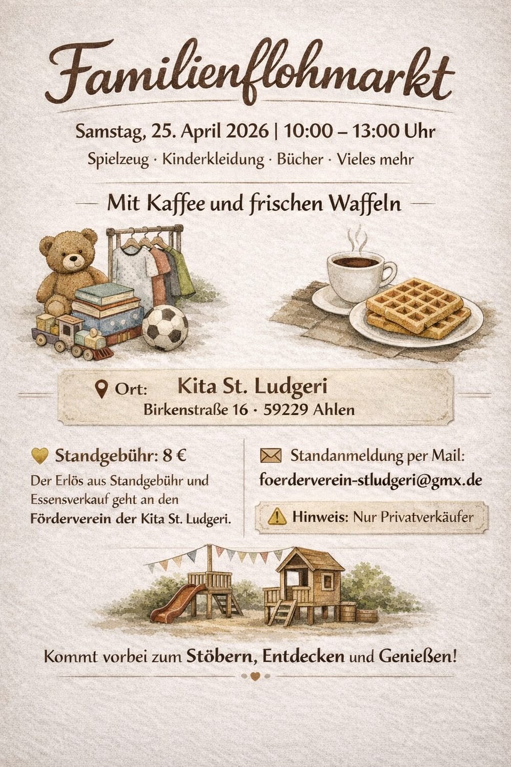Der Förderverein der Kita St. Ludgeri lädt herzlich zu einem Familienflohmarkt (Privatverkauf) auf dem Außengelände der Kita ein.