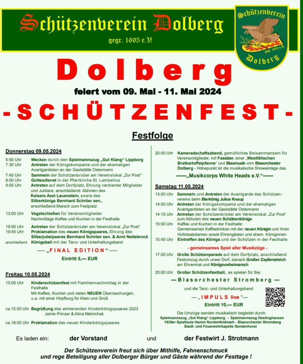 17.00 Uhr: Große Schützenparade auf dem Dorfplatz mit anschl. Festumzug, Großer Zapfenstreich am Ehrenmal und Königsvorbeimarsch