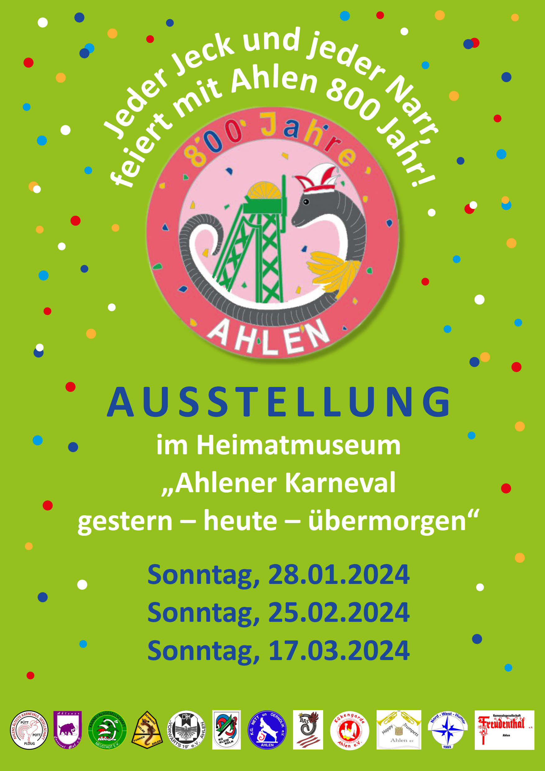 Unter dem Motto „Ahlensia Helau. Ahlener Karnaval gestern - heute - übermorgen“ werden die Karnevalsvereine mit spannenden Exponaten und geballter Man- und Womanpower karnevalistische Stimmung ins Heimatmuseum bringen. Die Geschichte des Ahlener Karnevals und ihren Karnevalsgesellschaften wird so bunt und voller Engagement präsentiert.