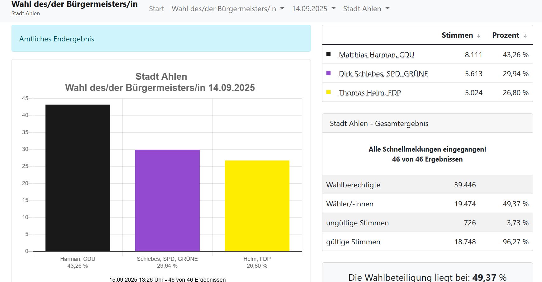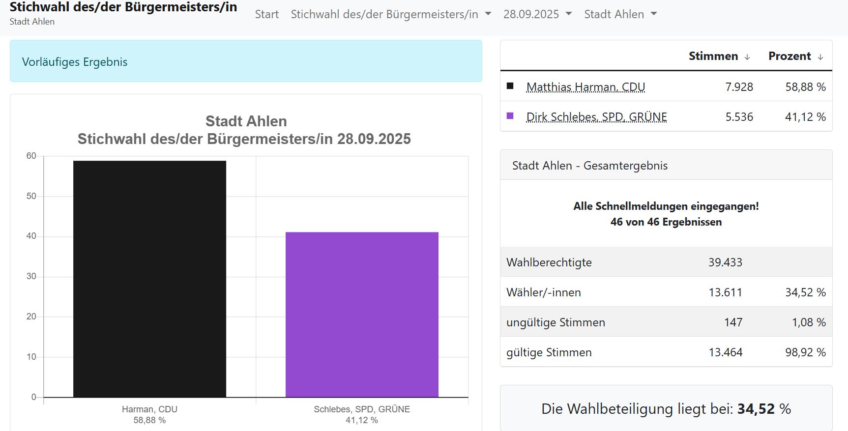 Stichwahl zum Bürgermeister der Stadt Ahlen am 28. September 2025
