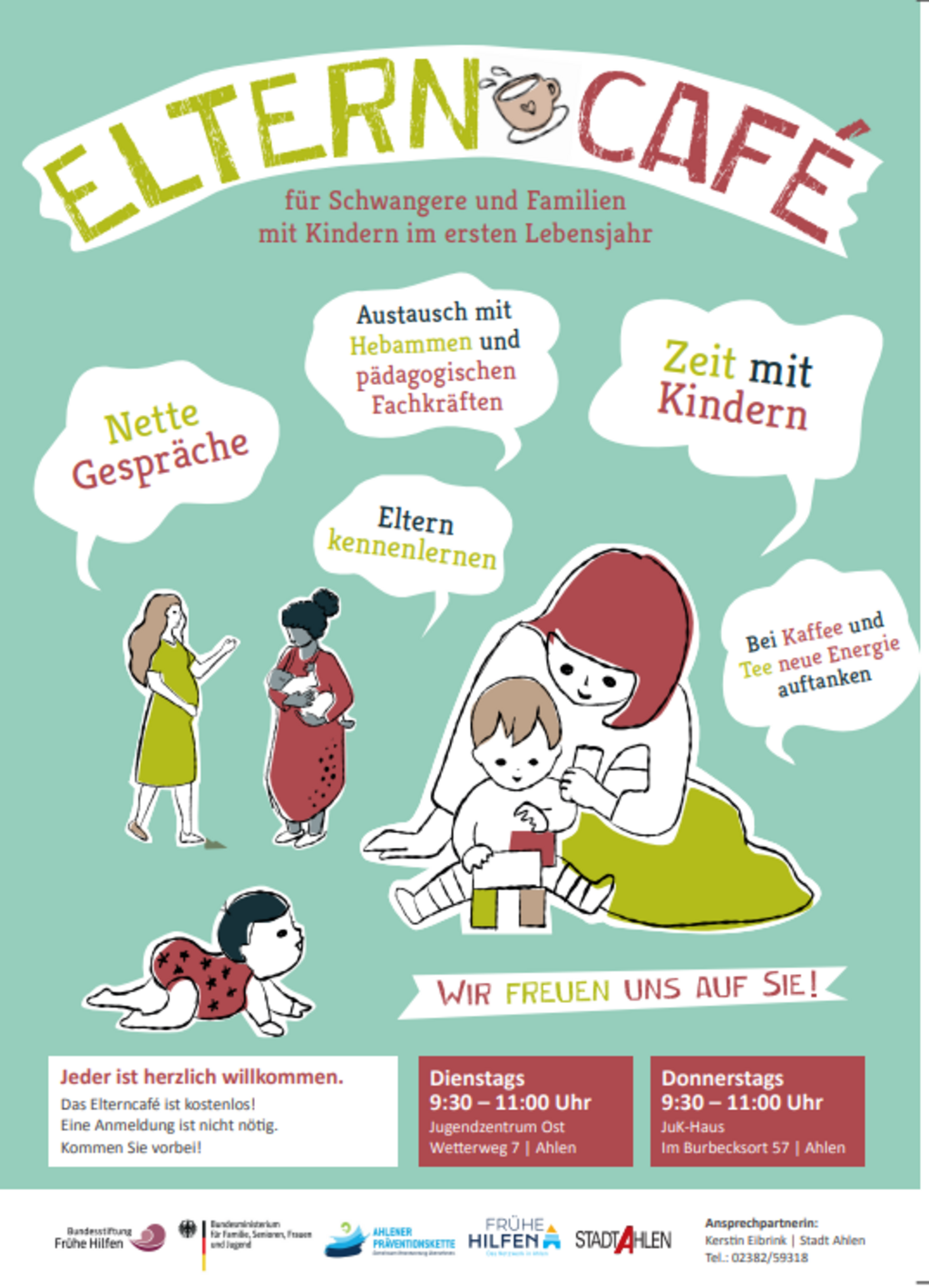 In Ahlen bieten wir verschiedene offene Treffpunkte für werdende Eltern und junge Familien an. Das Elterncafé im Süd/Osten der Stadt richtet sich an werdende Eltern und Familien mit Kindern im ersten Lebensjahr. Das Angebot ist kostenlos und es ist keine Anmeldung erforderlich.