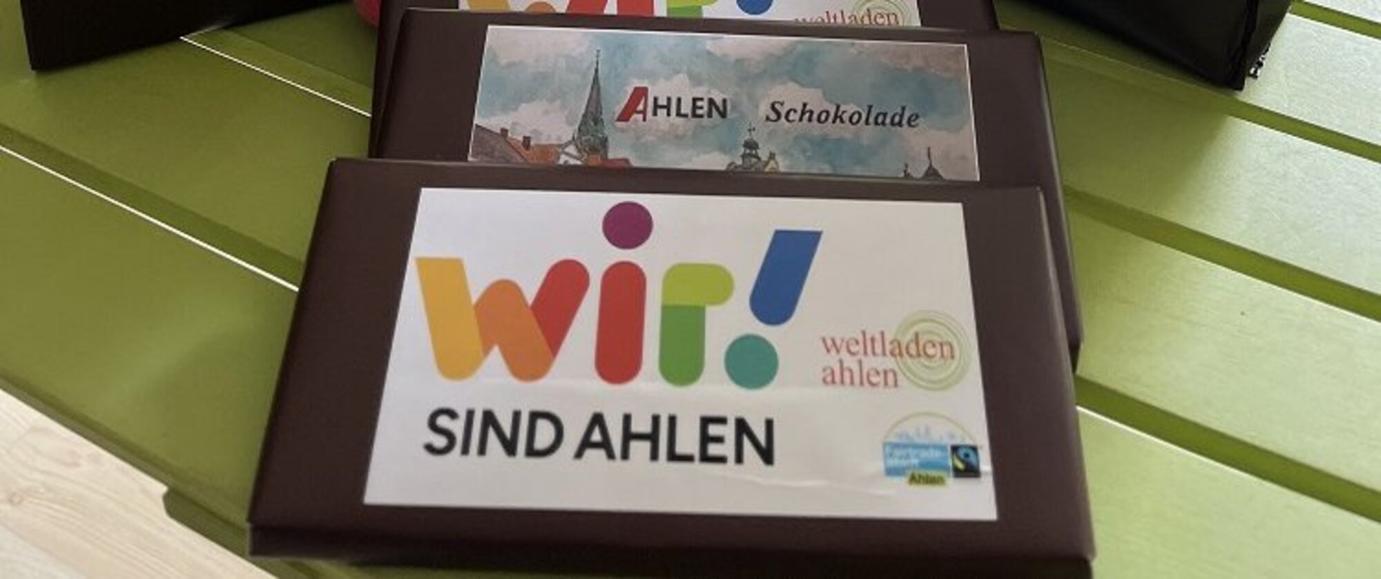 Im Weltladen Ahlen können fairer Kaffee und faire Schokolade mit dem Ahlener Stadtlogo erworben werden. Ein gutes Signal für die Kooperation zwischen dem Weltladen Ahlen und der Stadt Ahlen.